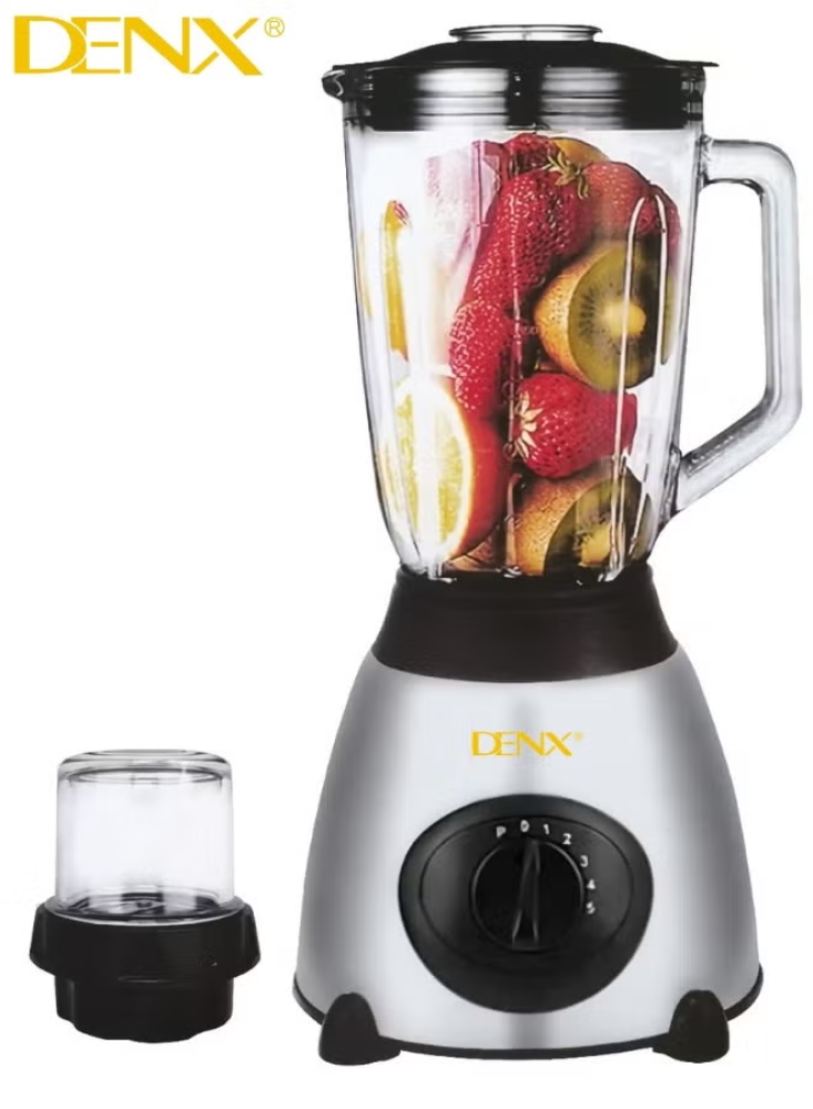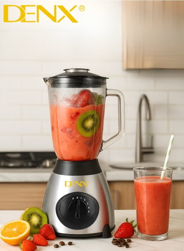 خلاط كهربائي عالي القدرة من DENX DX2001 – قوة 2800 واط، كأس زجاجي مقاوم للخدش بسعة 1.5 لتر، شفرات ستانلس ستيل قوية لتكسير الثلج وطحن القهوة والبهارات، 5 مستويات سرعة مع حماية حرارية، تصميم أنيق متعدد الوظائف وصديق للبيئة